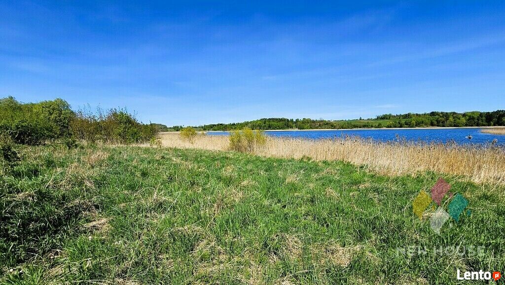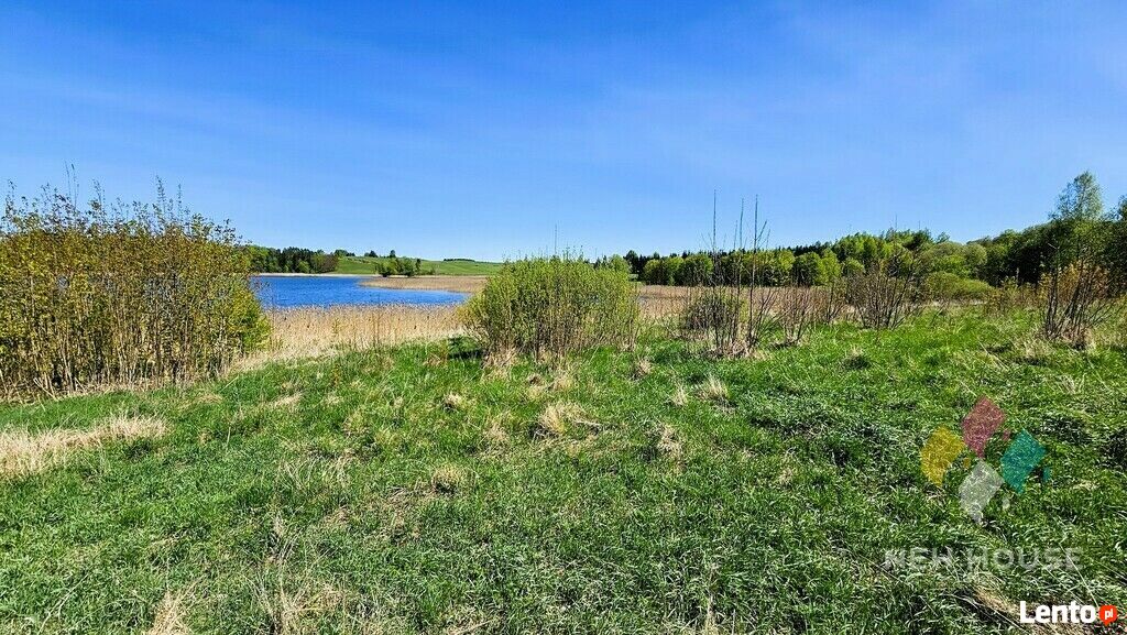malowniczy widok na taflę wody, okoliczne łąki, pola i las. Duży
