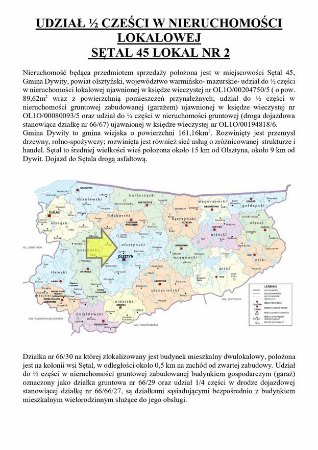 SYNDYK MASY UPADŁOŚCI osoby fizycznej nieprowadzącej działalności gospodarczej sprzeda udział 1/2 części w nieruchomości lokalowej o powierzchni użytkowej 89,62 m² położonej w miejscowości Sętal 45 lok 2, woj. Warmińsko-Mazurskie, ujawnionej w KW nr OL1O/00204750/5 wraz z udziałem 1/2 części w nieruchomości gruntowej zabudowanej garażem KW nr OL1O/00080093/5 oraz udziałem 1/4 części w nieruchomosci stanowiącej drogę dojazdową ujawnioną w KW nr OL1O/00194818/6 - za cenę nie niższą niż 3/4 ich wartości oszacowania: 103.500,00 zł (wartość oszacowania: 138.000,00 zł).Sprzedaż prowadzona jest w formie konkursu ofert. Oferty pisemne, z podaniem proponowanej ceny należy składać w Kancelarii Notarialnej Zbigniewa Stankiewicza w Olsztynie przy ul. Dąbrowszczaków 18/4, tel. (89) 527 32 30 - w terminie do dnia 4 lutego 2026r.